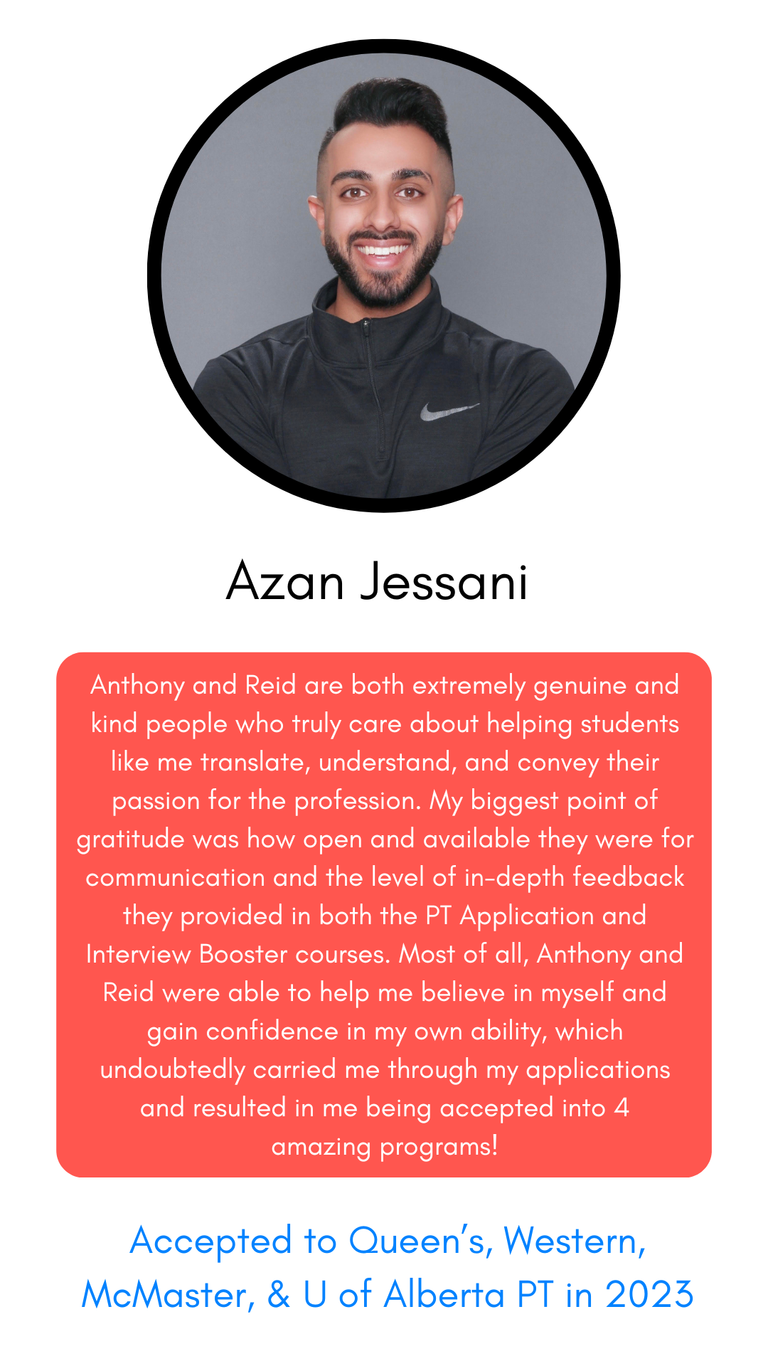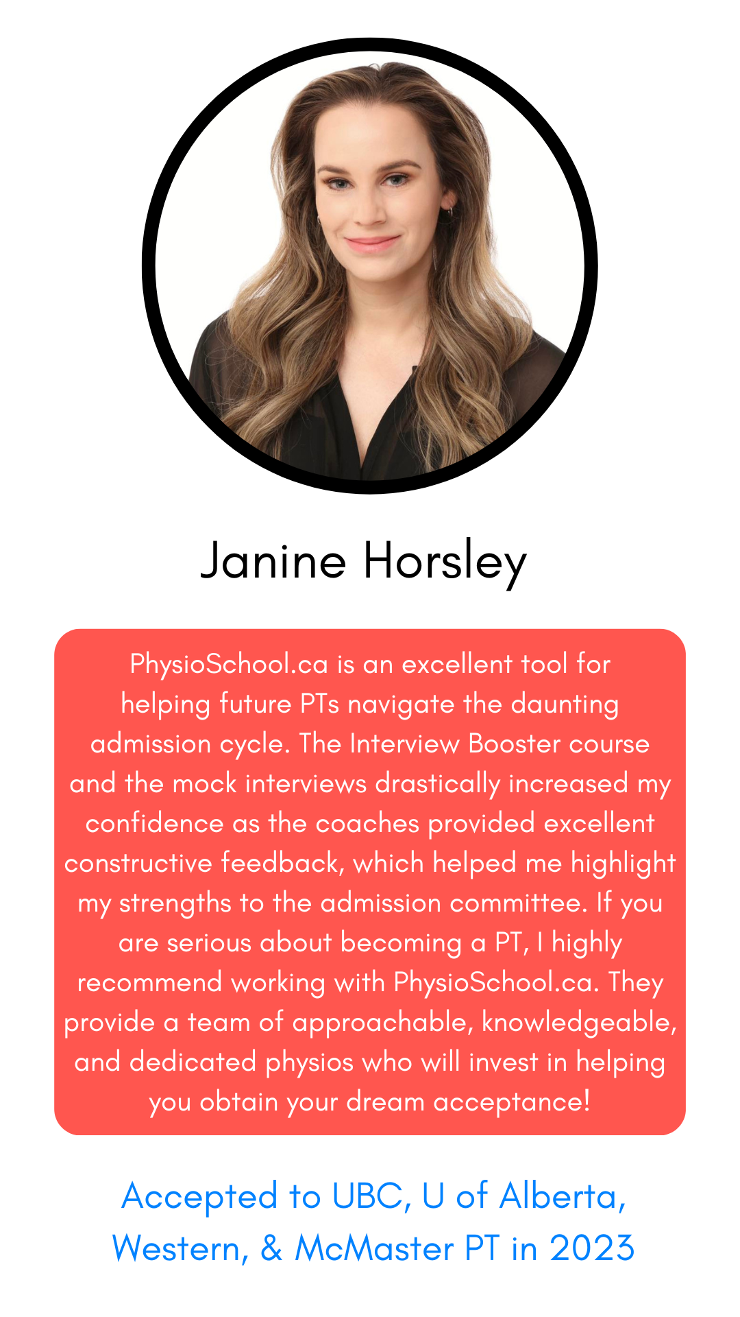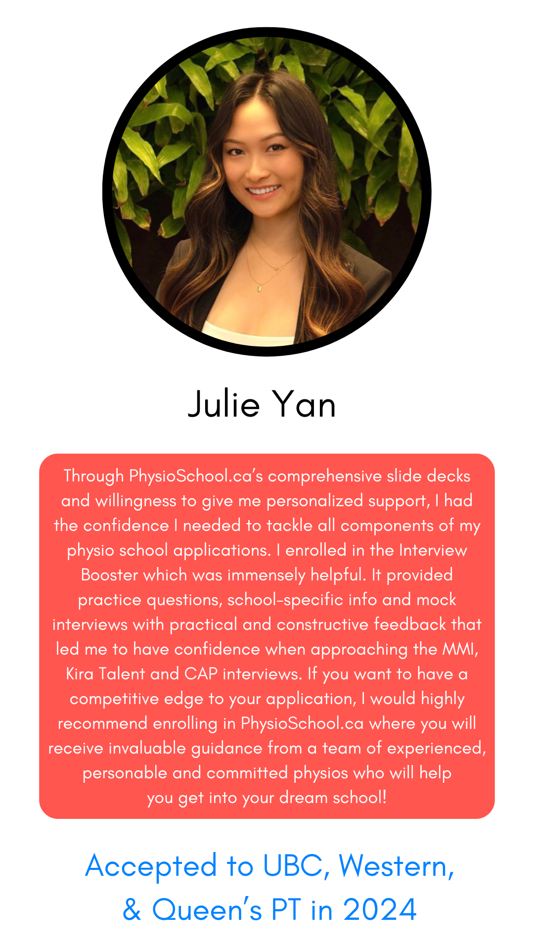Generally, there are two phases you have to go through when applying to physio school. The first is the pre-interview phase and the second is the interview phase. We’ve developed two courses that will help you succeed through BOTH stages of your application. The PT Application Booster is designed to help you with the pre-interview phase. The PT Interview Booster is designed to help you with the interview phase of admission.