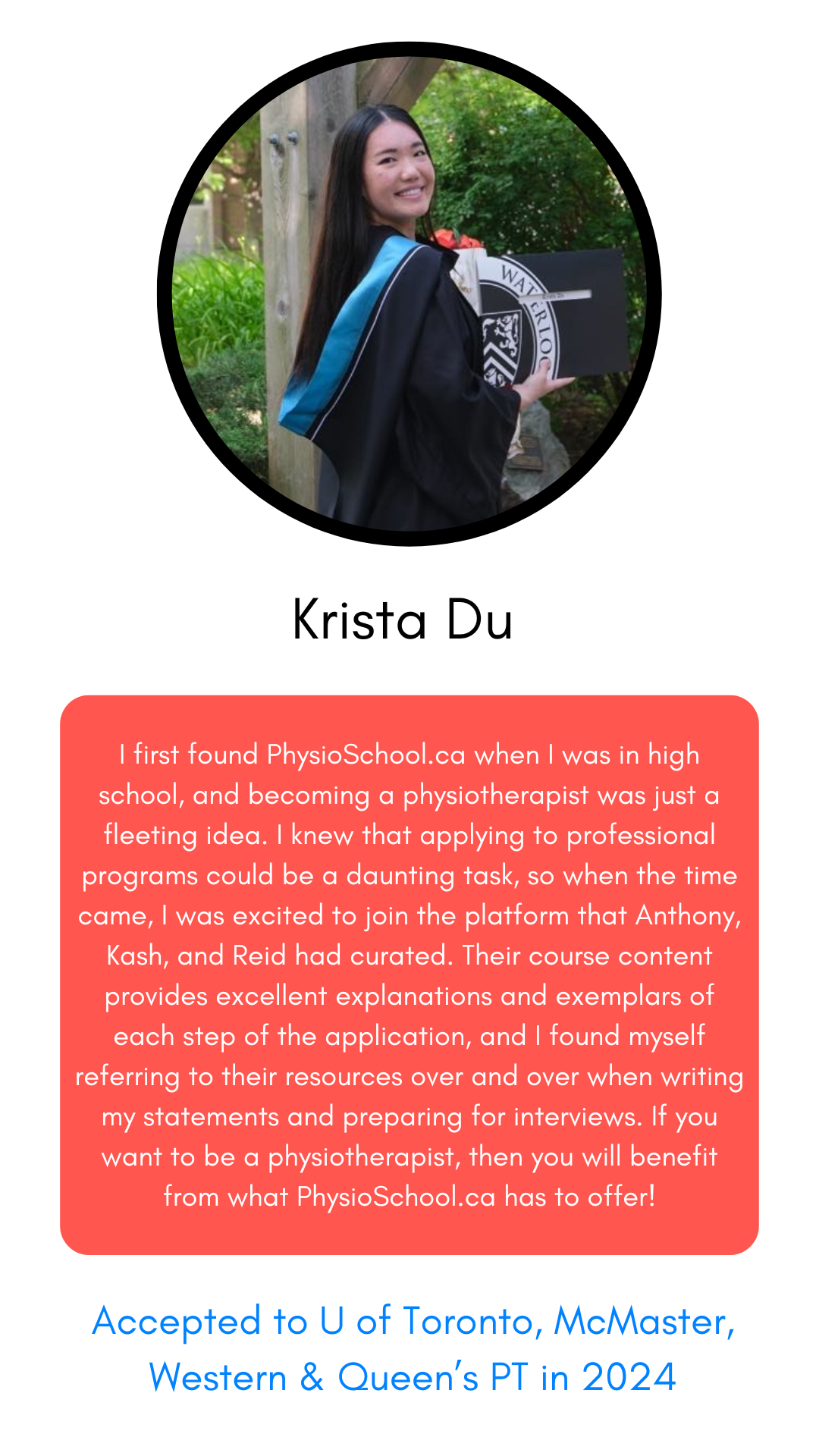 We know what it takes to get into physiotherapy school. Not only has our team been accepted to multiple physio programs, but we've helped students get into physiotherapy programs all across Canada.